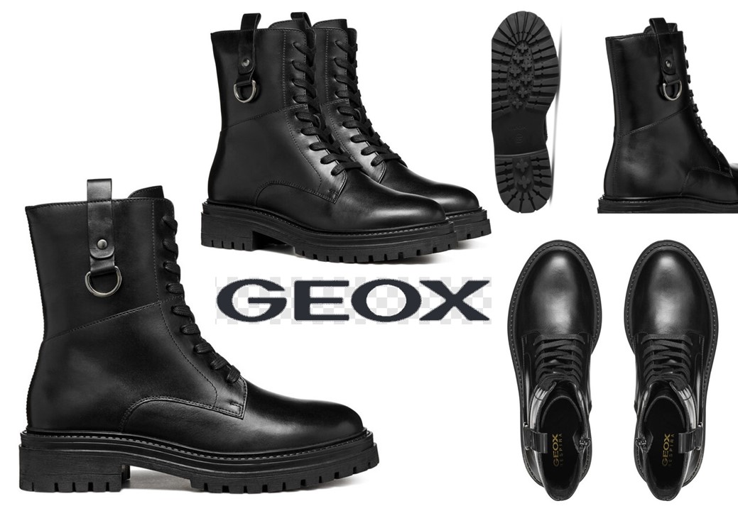 Anfibi Donna GEOX D46HRB 00043 C9999 D IRIDEA B Colore Nero Black. Design biker stile motociclista, con lacci e zip laterale per una calzata pratica. Stile casual rock, perfetti per l'autunno e l'inverno. Altezza alla caviglia, tacco basso comodo, suola antiscivolo. Materiale in vera pelle impermeabile e traspirante, ideale per look urban, punk o street. Modello che richiama il design dei Chelsea, Beatles e anfibi classici.