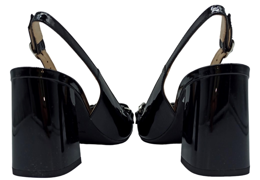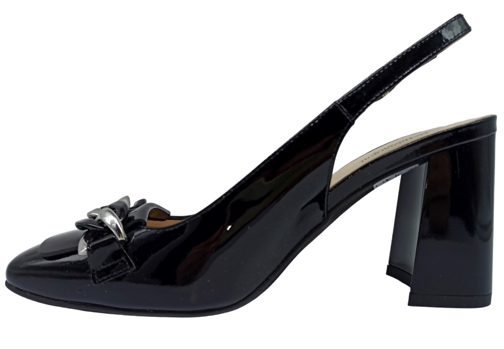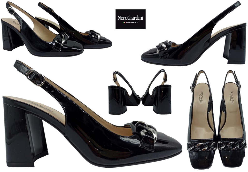 Decolleté da Donna Nero Giardini E409490D 100 Colore Nero. Eleganti e sofisticate, queste décolleté Nero Giardini uniscono artigianalità Made in Italy e design contemporaneo. Realizzate in pelle verniciata di alta qualità, sono impreziosite da una catena centrale decorativa e dotate di un comodo cinturino alla caviglia per una calzata stabile e sicura. Il tacco alto di 8,7 cm è reso confortevole grazie al cuscinetto sotto la pianta, studiato per attutire le sollecitazioni e garantire il massimo comfort durante tutta la giornata.Perfette per l’estate, queste scarpe leggere e versatili si adattano a ogni occasione: da indossare con abiti eleganti per un evento serale o con jeans, shorts, pantaloni in lino o a palazzo per un look da giorno sofisticato e di tendenza. Ideali per un outfit glamour da aperitivo o un look safari chic, valorizzano l’abbronzatura e aggiungono un tocco ultra femminile a ogni stile.