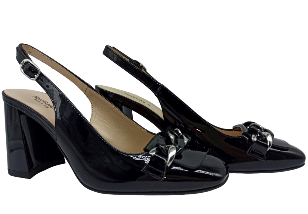 Decolleté da Donna Nero Giardini E409490D 100 Colore Nero. Eleganti e sofisticate, queste décolleté Nero Giardini uniscono artigianalità Made in Italy e design contemporaneo. Realizzate in pelle verniciata di alta qualità, sono impreziosite da una catena centrale decorativa e dotate di un comodo cinturino alla caviglia per una calzata stabile e sicura. Il tacco alto di 8,7 cm è reso confortevole grazie al cuscinetto sotto la pianta, studiato per attutire le sollecitazioni e garantire il massimo comfort durante tutta la giornata.Perfette per l’estate, queste scarpe leggere e versatili si adattano a ogni occasione: da indossare con abiti eleganti per un evento serale o con jeans, shorts, pantaloni in lino o a palazzo per un look da giorno sofisticato e di tendenza. Ideali per un outfit glamour da aperitivo o un look safari chic, valorizzano l’abbronzatura e aggiungono un tocco ultra femminile a ogni stile.