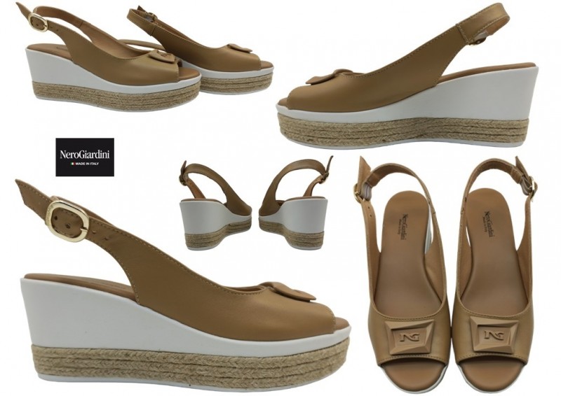 Sandali da Donna Nero Giardini E307715D Cuoio Sabbia Scarpe con Zeppa Alta 7 cm e Plateau di 3,5 cm Comode Casual Eleganti Leggere alla Moda Glamour di Tendenza da Passeggio Sexy. NeroGiardini azienda leader nella produzione artigianale Made in Italy propone queste Scarpe per l'Estate con Tomaia in Vera Pelle.  La zeppa alleggerita è di colore bianco con parte in corda color beige, mentre il cuscinetto sotto la pianta la rende molto confortevole. Chiusura con Cinturino alla Caviglia. Da indossare anche con un jeans, un pantaloncino-shorts, un abito o dei pantaloni in lino, con dei pantaloni larghi o a palazzo, per un look giornaliero, da aperitivo, ideale anche per un look safari, chic, femme, femminino, mujer, per un outfit ultra femminile.