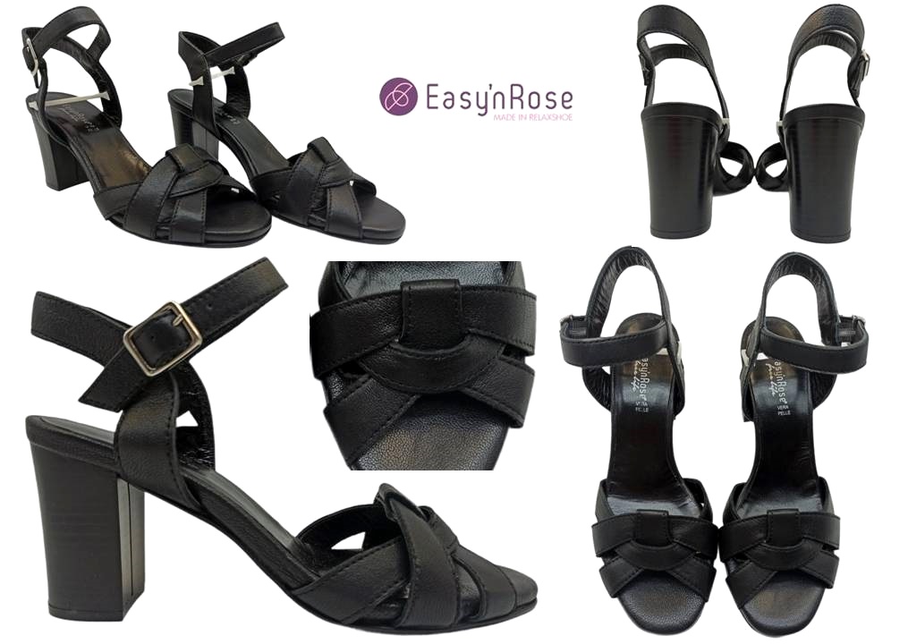 Sandali da Donna Easy'nRose 737-006 Colore Nero. Scarpe da donna eleganti e versatili, perfette per l'estate con tomaia in vera pelle morbida e traspirante. Il design è raffinato e femminile, pensato per garantire comfort e stile anche nelle giornate più calde. Dotati di un tacco medio da 8,3 cm, comodo e stabile, ideale per ammortizzare le sollecitazioni del terreno. Il cuscinetto sotto la pianta del piede assicura un’ottima calzata, rendendo questi sandali perfetti per chi desidera coniugare eleganza e benessere. Chiusura con cinturino alla caviglia per una calzata sicura. Leggeri e flessibili, si abbinano facilmente a jeans, shorts, abiti estivi, pantaloni in lino o a palazzo. Perfetti per un look casual da giorno, un aperitivo serale o un outfit safari chic, adatti a uno stile femminile e glamour