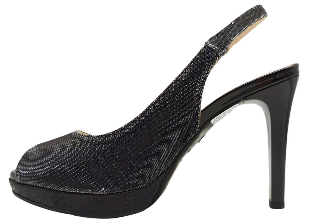 Sandalo da Donna Nero Giardini E218322DE 100 Colore Nero. Raffinato e luminoso, questo sandalo open toe firmato Nero Giardini è il perfetto equilibrio tra stile e comodità. Realizzato in pelle laminata glitterata, con chiusura slingback con cinturino alla caviglia, dona slancio alla figura grazie al tacco alto di 9,5 cm, bilanciato da un comodo plateau in gomma da 1,5 cm che attutisce l’impatto col suolo. Un modello pensato per l’estate, firmato da un marchio sinonimo di qualità artigianale Made in Italy, ideale per chi desidera un design elegante ma non vuole rinunciare al comfort.Perfetto da indossare con abiti da sera, pantaloni in lino, shorts, jeans larghi o a palazzo, per un look giornaliero ricercato o da aperitivo glamour. Il colore nero glitterato valorizza l’abbronzatura e aggiunge un tocco ultra femminile e di tendenza a ogni outfit.