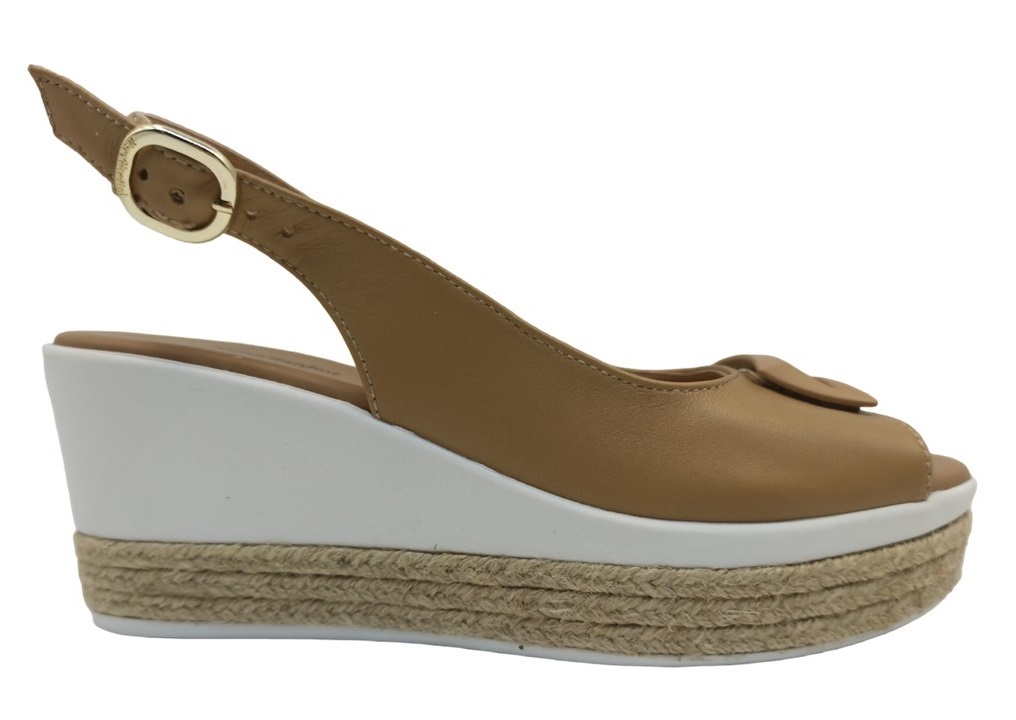 Sandali da Donna Nero Giardini E307715D 423 Colore Cuoio. Comodità e stile si incontrano in questi sandali con zeppa alta da 7 cm e plateau da 3,5 cm, firmati NeroGiardini, eccellenza della produzione artigianale Made in Italy. La tomaia in vera pelle garantisce qualità e resistenza, mentre il cuscinetto sotto la pianta assicura massimo comfort anche nelle giornate più intense.La zeppa, dal design alleggerito, è rifinita in bianco e corda beige, per un look fresco e raffinato. La chiusura con cinturino alla caviglia offre stabilità ed eleganza, rendendo queste scarpe ideali per l'estate.Versatili e alla moda, si abbinano perfettamente a jeans, shorts, abiti leggeri, pantaloni in lino o palazzo, per un look casual-chic da giorno o un outfit da aperitivo. Perfette anche per uno stile glamour, safari-chic o femminile raffinato, valorizzano l’abbronzatura e aggiungono un tocco trendy e sensuale al tuo guardaroba estivo.
