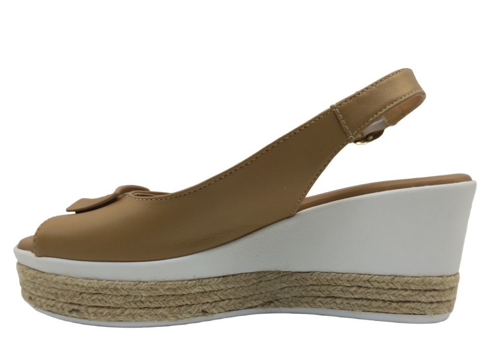 Sandali da Donna Nero Giardini E307715D 423 Colore Cuoio. Comodità e stile si incontrano in questi sandali con zeppa alta da 7 cm e plateau da 3,5 cm, firmati NeroGiardini, eccellenza della produzione artigianale Made in Italy. La tomaia in vera pelle garantisce qualità e resistenza, mentre il cuscinetto sotto la pianta assicura massimo comfort anche nelle giornate più intense.La zeppa, dal design alleggerito, è rifinita in bianco e corda beige, per un look fresco e raffinato. La chiusura con cinturino alla caviglia offre stabilità ed eleganza, rendendo queste scarpe ideali per l'estate.Versatili e alla moda, si abbinano perfettamente a jeans, shorts, abiti leggeri, pantaloni in lino o palazzo, per un look casual-chic da giorno o un outfit da aperitivo. Perfette anche per uno stile glamour, safari-chic o femminile raffinato, valorizzano l’abbronzatura e aggiungono un tocco trendy e sensuale al tuo guardaroba estivo.