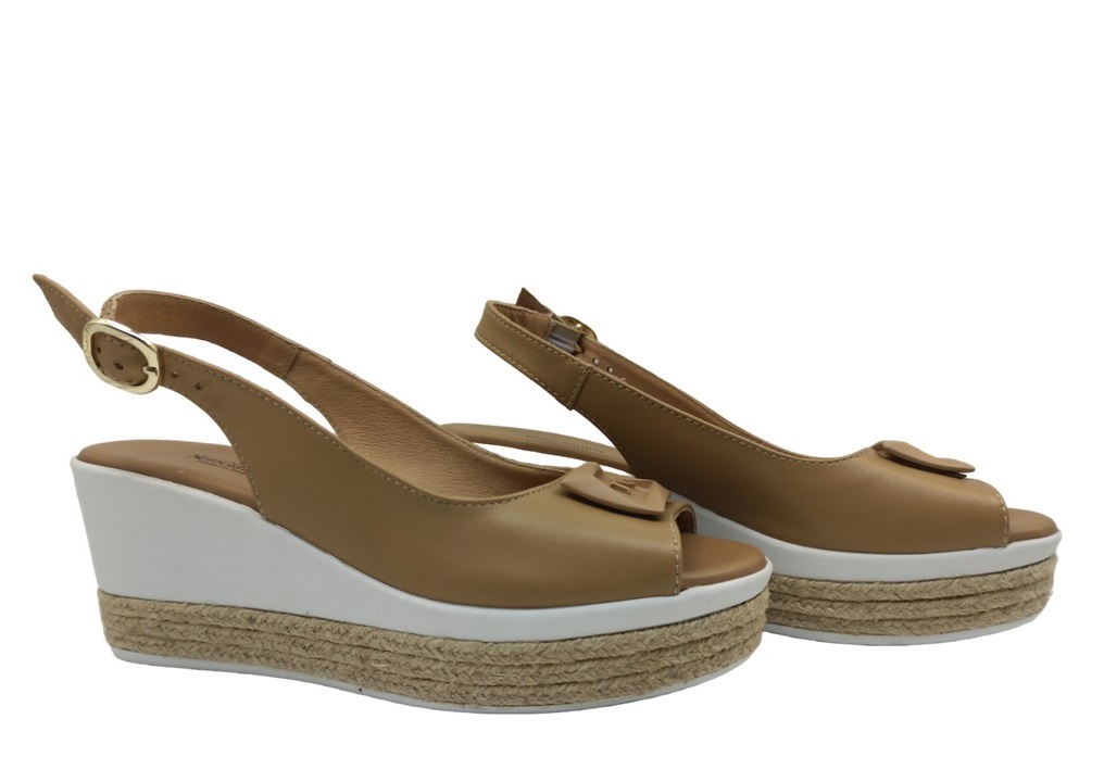 Sandali da Donna Nero Giardini E307715D 423 Colore Cuoio. Comodità e stile si incontrano in questi sandali con zeppa alta da 7 cm e plateau da 3,5 cm, firmati NeroGiardini, eccellenza della produzione artigianale Made in Italy. La tomaia in vera pelle garantisce qualità e resistenza, mentre il cuscinetto sotto la pianta assicura massimo comfort anche nelle giornate più intense.La zeppa, dal design alleggerito, è rifinita in bianco e corda beige, per un look fresco e raffinato. La chiusura con cinturino alla caviglia offre stabilità ed eleganza, rendendo queste scarpe ideali per l'estate.Versatili e alla moda, si abbinano perfettamente a jeans, shorts, abiti leggeri, pantaloni in lino o palazzo, per un look casual-chic da giorno o un outfit da aperitivo. Perfette anche per uno stile glamour, safari-chic o femminile raffinato, valorizzano l’abbronzatura e aggiungono un tocco trendy e sensuale al tuo guardaroba estivo.