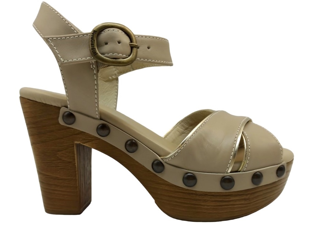 Sandali Zoccoli da Donna Nero Giardini E307790D 410 Colore Sabbia. Nero Giardini, marchio leader nella produzione artigianale Made in Italy, presenta questi zoccoli estivi dal fascino raffinato e contemporaneo. Realizzati in morbida pelle con fasce incrociate e cinturino regolabile alla caviglia, si distinguono per la cura dei dettagli e l’eleganza senza tempo.Il fondo effetto legno con tacco alto 9,5 cm e plateau 3,5 cm dona slancio alla figura garantendo al tempo stesso stabilità e comfort, perfetti per chi desidera l’altezza senza rinunciare alla comodità. Dal design glamour e leggero, con un tocco retrò di grande tendenza, questi sandali si adattano a molteplici occasioni: dal look casual quotidiano all’aperitivo serale. Ideali da indossare con jeans, shorts, abiti estivi, pantaloni in lino bianco o modelli ampi a palazzo, per outfit versatili e sempre femminili