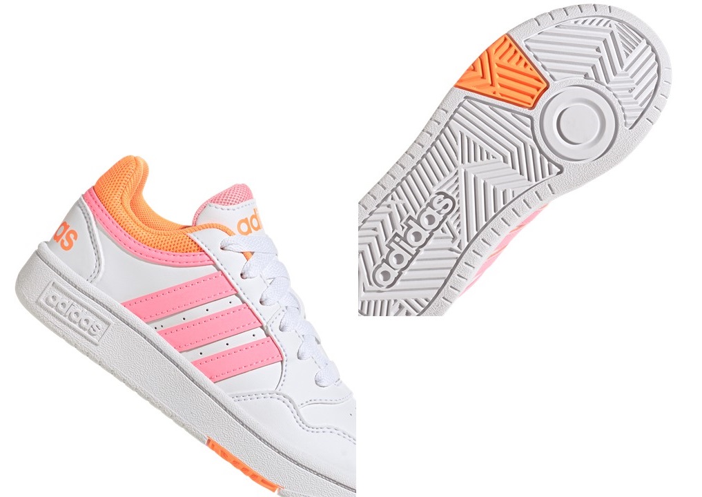 Scarpe da Bambina Bimba Adidas HOOPS 3.0 GZ9672 Colore Bianco con profili arancio e baffatura rosa. Sneakers basse sportive e casual, versatili per scuola, tempo libero e passeggiate. Perfette per attività sportive come ginnastica, palestra, allenamento, basket, skateboarding. Chiusura lacci, Tomaia in Similpelle, Plantare estraibile per maggiore igiene e praticità.