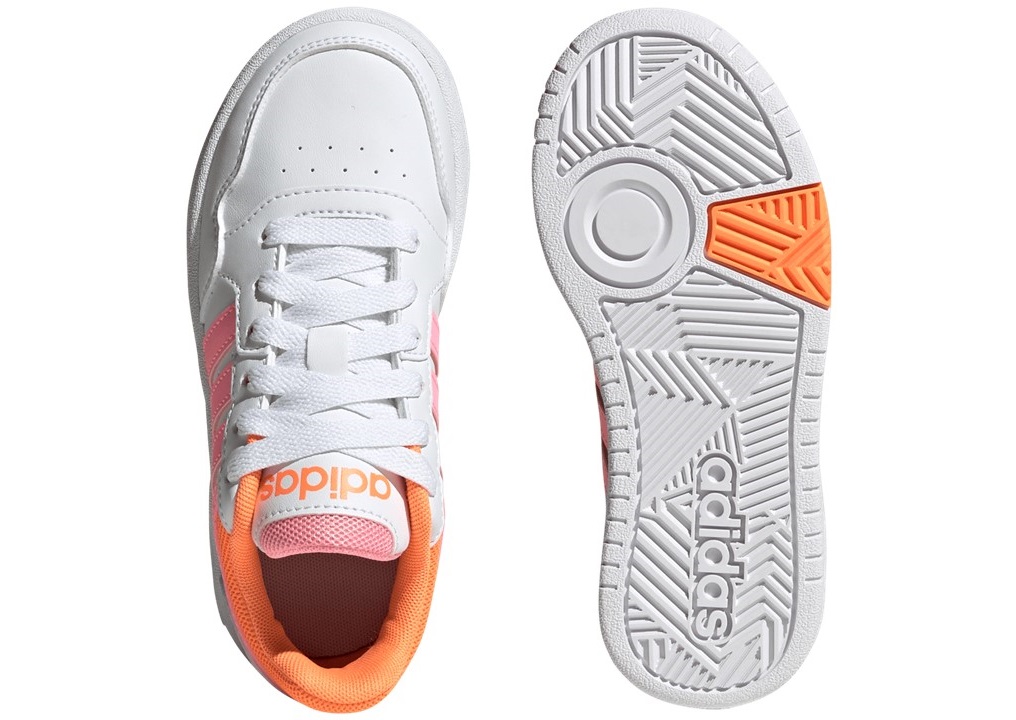 Scarpe da Bambina Bimba Adidas HOOPS 3.0 GZ9672 Colore Bianco con profili arancio e baffatura rosa. Sneakers basse sportive e casual, versatili per scuola, tempo libero e passeggiate. Perfette per attività sportive come ginnastica, palestra, allenamento, basket, skateboarding. Chiusura lacci, Tomaia in Similpelle, Plantare estraibile per maggiore igiene e praticità.