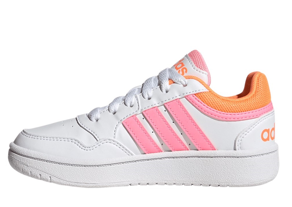 Scarpe da Bambina Bimba Adidas HOOPS 3.0 GZ9672 Colore Bianco con profili arancio e baffatura rosa. Sneakers basse sportive e casual, versatili per scuola, tempo libero e passeggiate. Perfette per attività sportive come ginnastica, palestra, allenamento, basket, skateboarding. Chiusura lacci, Tomaia in Similpelle, Plantare estraibile per maggiore igiene e praticità.