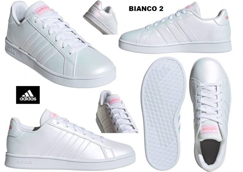 Scarpe da Donna Bambina ADIDAS GRAND COURT K EF0102 - GV7109 - GZ5258 Sneakers Colore Nero e Bianco Casual Comode Basse alla Moda Di Tendenza per il Tempo Libero Da Passeggio Chiusura con Stringhe Lacci Plantare Interno Estraibile Autunnale Invernale Primaverile Estivo