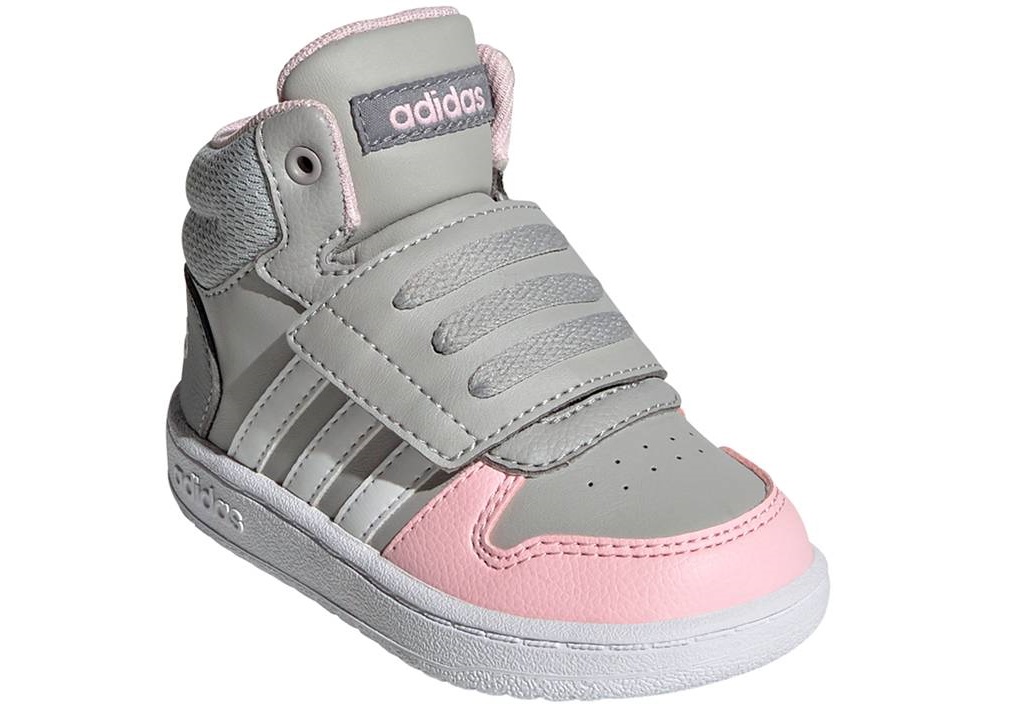 Scarpe da Tennis Infant Bambina Bimba Bambini Adidas HOOPS MID 2.0 I GZ7779 Colore Grigio Rosa Bianco.  Sneakers alte sportive e casual, versatili per scuola, tempo libero e passeggiate. Perfette per attività sportive come ginnastica, palestra, allenamento, basket, skateboarding. Chiusura comoda con strappo ideale per i più piccoli, Tomaia in Similpelle, Plantare estraibile per maggiore igiene e praticità. Ideali per la stagione autunno/inverno