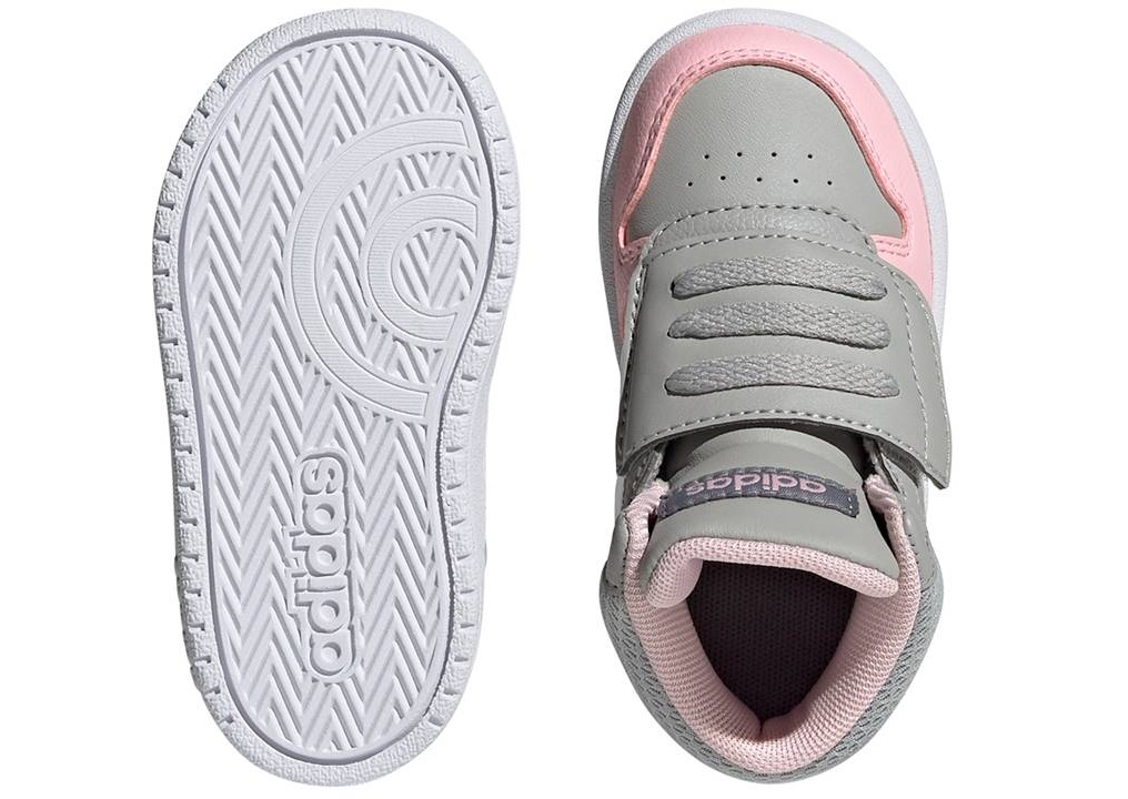 Scarpe da Tennis Infant Bambina Bimba Bambini Adidas HOOPS MID 2.0 I GZ7779 Colore Grigio Rosa Bianco.  Sneakers alte sportive e casual, versatili per scuola, tempo libero e passeggiate. Perfette per attività sportive come ginnastica, palestra, allenamento, basket, skateboarding. Chiusura comoda con strappo ideale per i più piccoli, Tomaia in Similpelle, Plantare estraibile per maggiore igiene e praticità. Ideali per la stagione autunno/inverno