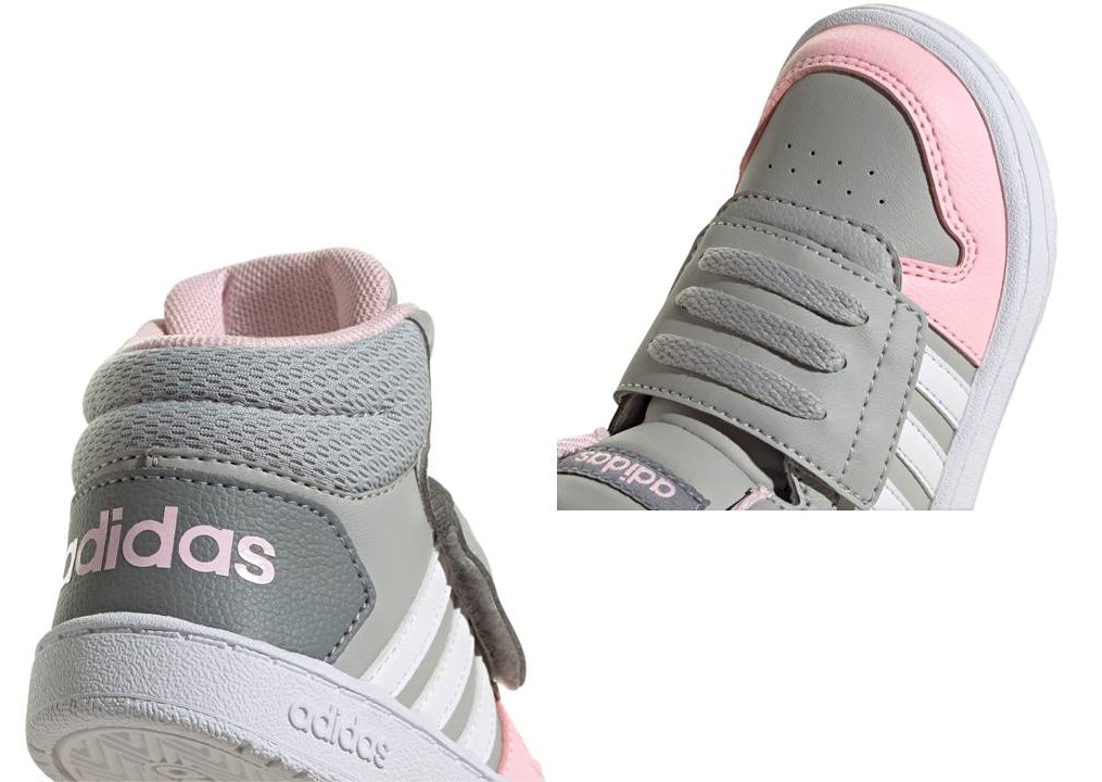 Scarpe da Tennis Infant Bambina Bimba Bambini Adidas HOOPS MID 2.0 I GZ7779 Colore Grigio Rosa Bianco.  Sneakers alte sportive e casual, versatili per scuola, tempo libero e passeggiate. Perfette per attività sportive come ginnastica, palestra, allenamento, basket, skateboarding. Chiusura comoda con strappo ideale per i più piccoli, Tomaia in Similpelle, Plantare estraibile per maggiore igiene e praticità. Ideali per la stagione autunno/inverno