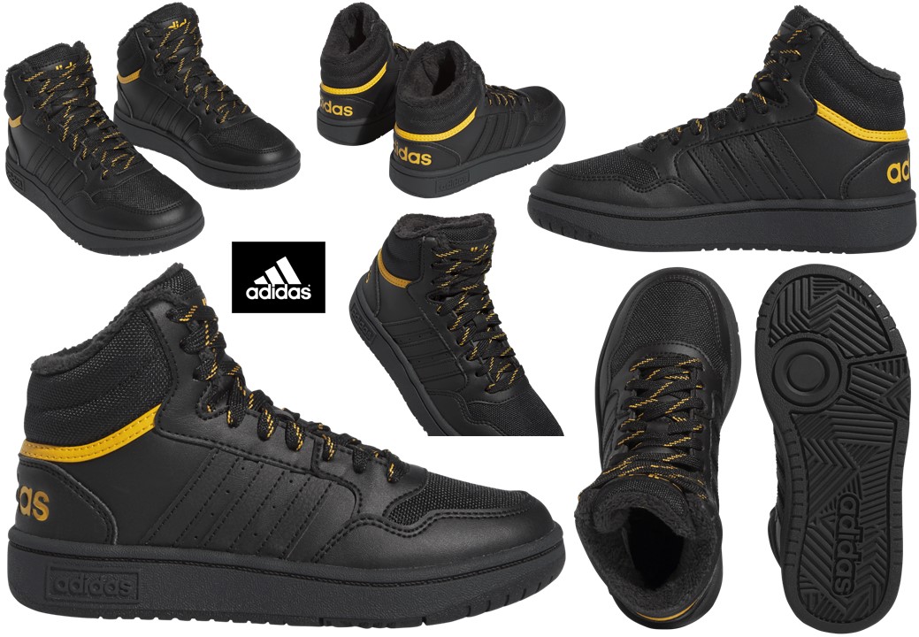 Scarpe da Bambino Adidas HOOPS MID 3.0 K IF7736 Colore Nero con profili gialli. Sneakers alte sportive e casual, versatili per scuola, tempo libero e passeggiate. Perfette per attività sportive come ginnastica, palestra, allenamento, basket, skateboarding. Chiusura con lacci, Tomaia in Similpelle, Interno felpato, Plantare estraibile per maggiore igiene e praticità. Ideali per la stagione autunno/inverno