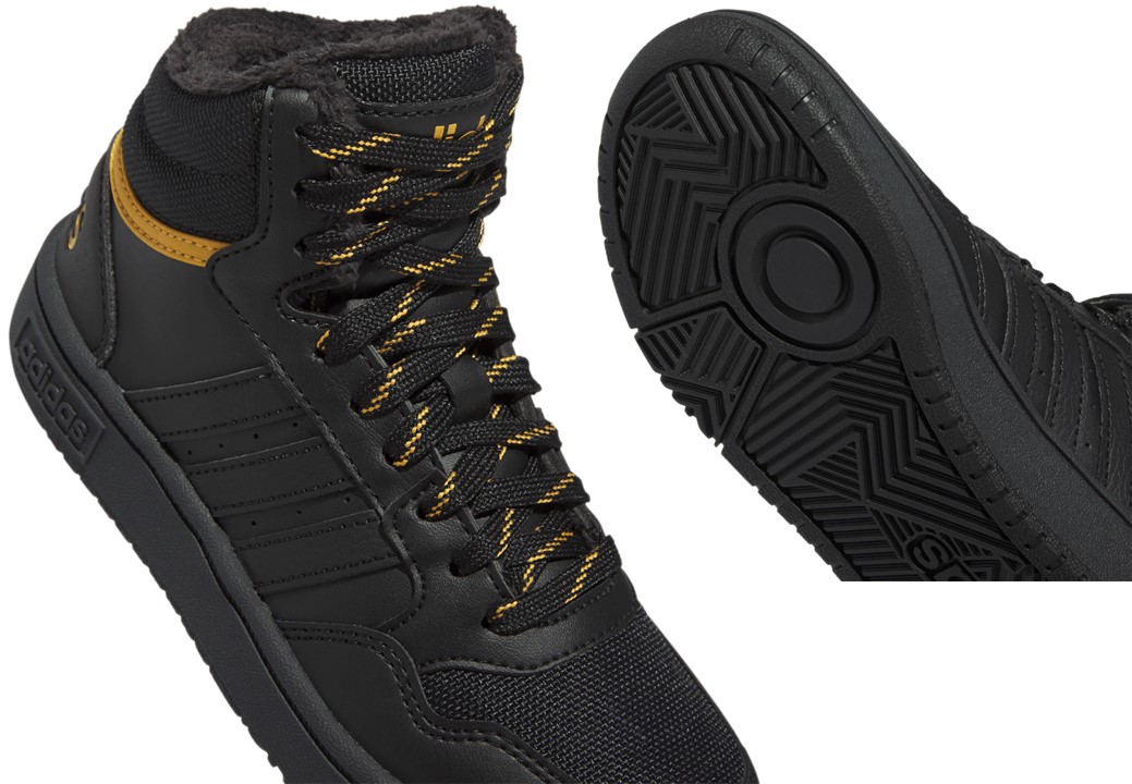 Scarpe da Bambino Adidas HOOPS MID 3.0 K IF7736 Colore Nero con profili gialli. Sneakers alte sportive e casual, versatili per scuola, tempo libero e passeggiate. Perfette per attività sportive come ginnastica, palestra, allenamento, basket, skateboarding. Chiusura con lacci, Tomaia in Similpelle, Interno felpato, Plantare estraibile per maggiore igiene e praticità. Ideali per la stagione autunno/inverno