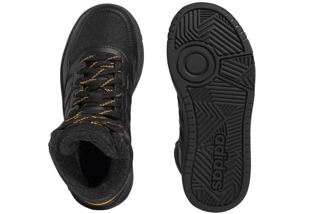 Scarpe da Bambino Adidas HOOPS MID 3.0 K IF7736 Colore Nero con profili gialli. Sneakers alte sportive e casual, versatili per scuola, tempo libero e passeggiate. Perfette per attività sportive come ginnastica, palestra, allenamento, basket, skateboarding. Chiusura con lacci, Tomaia in Similpelle, Interno felpato, Plantare estraibile per maggiore igiene e praticità. Ideali per la stagione autunno/inverno
