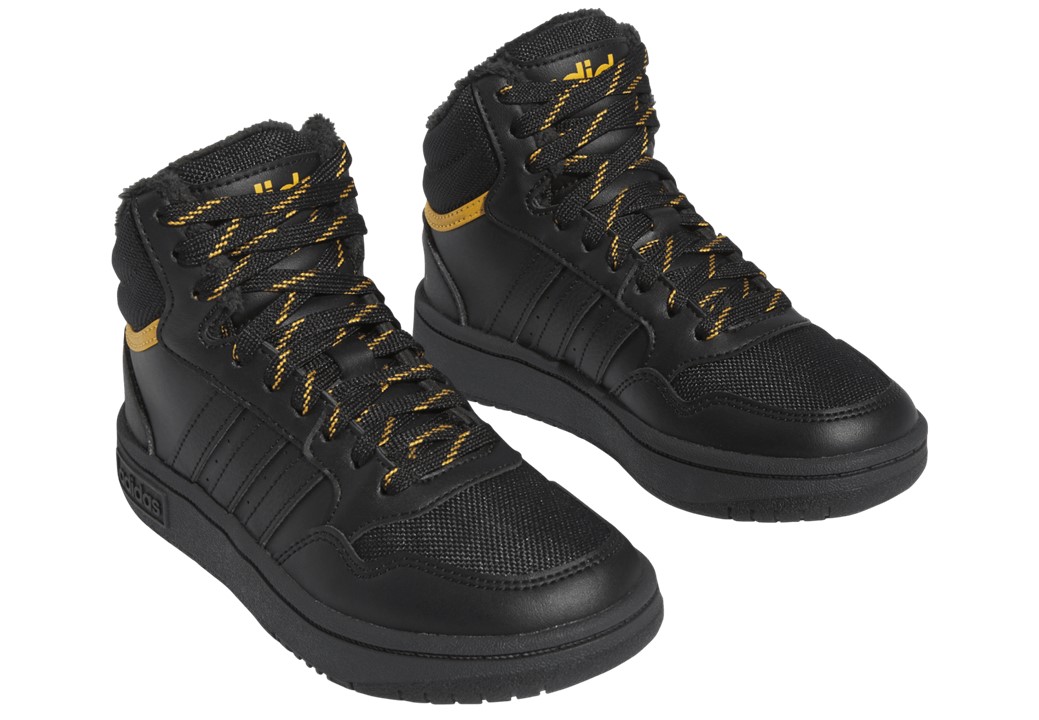 Scarpe da Bambino Adidas HOOPS MID 3.0 K IF7736 Colore Nero con profili gialli. Sneakers alte sportive e casual, versatili per scuola, tempo libero e passeggiate. Perfette per attività sportive come ginnastica, palestra, allenamento, basket, skateboarding. Chiusura con lacciTomaia in Similpelle, Interno felpato, Plantare estraibile per maggiore igiene e praticità. Ideali per la stagione autunno/inverno