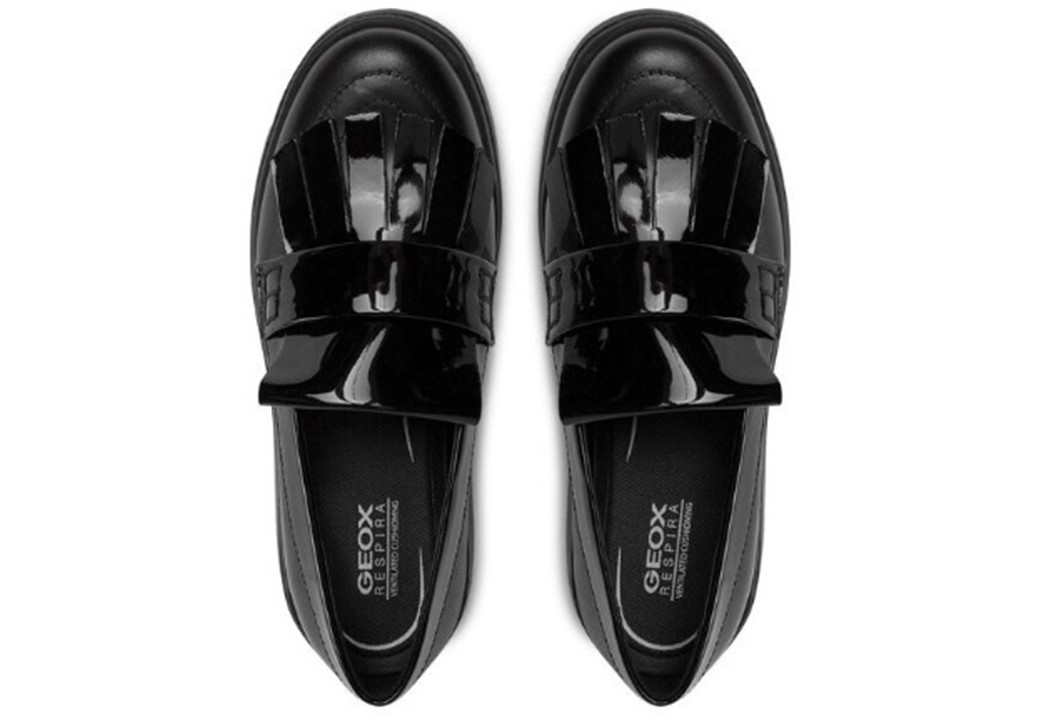 Scarpe da Donna Geox D36LCA 0Y3HH C9999 D ARLARA A Colore Nero Mocassini neri con tacco basso a zeppa da 4 cm e plateau da 2,5 cm. Realizzati in vera pelle con tomaia arricchita da frange, presentano chiusura slip-on pratica e plantare interno estraibile. Comodi e versatili, uniscono eleganza e stile casual, ideali per passeggiate o look quotidiani alla moda. Perfetti per la stagione autunno/inverno.