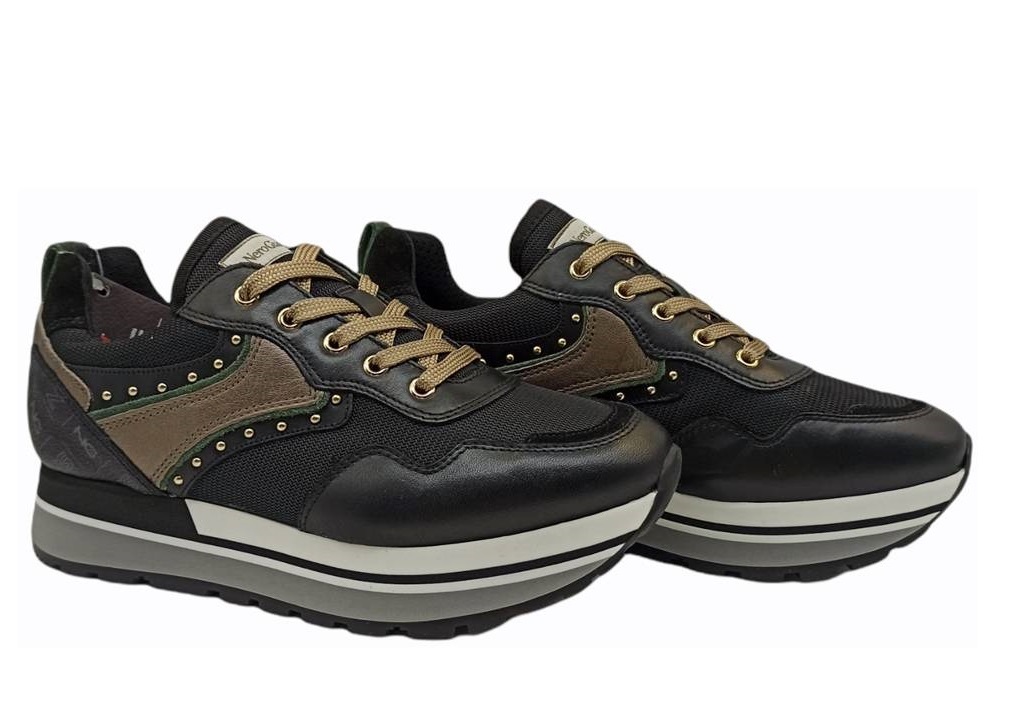 Scarpe da donna Nero Giardini I116940D 100 - I116941D 322 Colore Nero e Verdegris impreziosite con borchiette Sneakers Platform Basse Casual Sportive Comode alla Moda Glamour da Passeggio di Tendenza con Zeppa Tomaia in Vera Pelle Tessile Plantare Interno Estraibile Chiusura con Lacci Stringhe Made in Italy Autunno Inverno