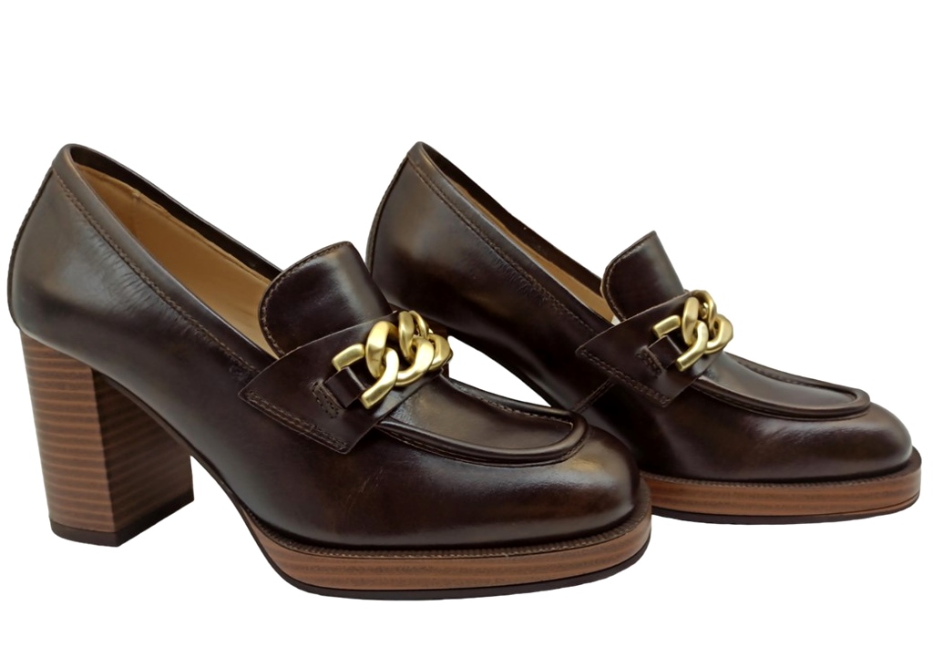 Scarpe da Donna Mocassini Nero Giardini I305060D 300 Colore Testa di Moro. Raffinati mocassini in vera pelle color testa di moro, con tacco medio da 8 cm e plateau da 1,5 cm per un’eleganza confortevole. Il design è impreziosito da una catenella centrale color oro che aggiunge un tocco glamour. Modello a infilare, perfetto per outfit casual e di tendenza nelle stagioni autunno e inverno. Realizzati in Italia con la qualità artigianale tipica del brand