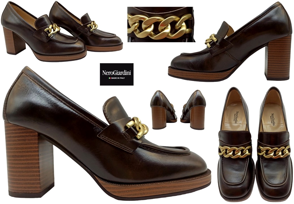 Scarpe da Donna Mocassini Nero Giardini I305060D 300 Colore Testa di Moro. Mocassini in vera pelle color testa di moro, pensati per unire stile e comodità. Il tacco medio da 8 cm con plateau da 1,5 cm slancia la figura mantenendo una calzata stabile. La catenella centrale color oro illumina il design con un dettaglio elegante e contemporaneo. Modello a infilare, ideale per look casual-chic e outfit di stagione, perfetto per autunno e inverno. Made in Italy, con la cura e la qualità artigianale tipiche di Nero Giardini.