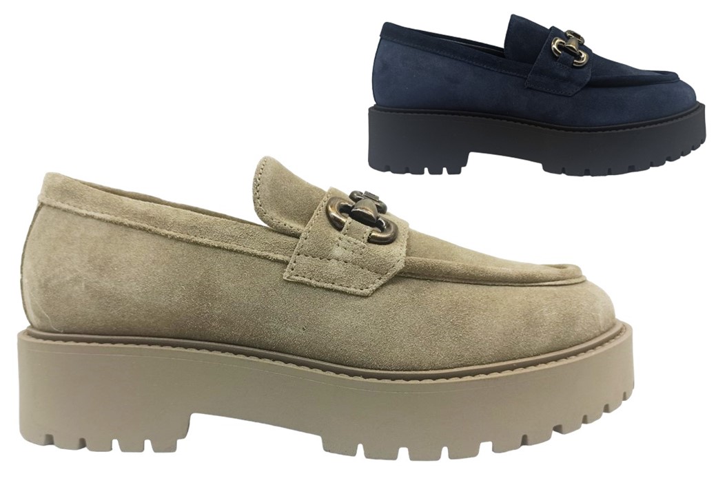 Scarpe da Donna Mocassini Nero Giardini I411390D 207 - I411390D 501 Colore Blu e Argilla con Tacco Basso 4 cm e Plateau 2,8 cm Impreziositi con catena centrale Casual Alla Moda da Passeggio di Tendenza Glamour Tomaia in Vera Pelle Scamosciata Camoscio Chiusura da infilare Made in Italy Autunnali Invernali
