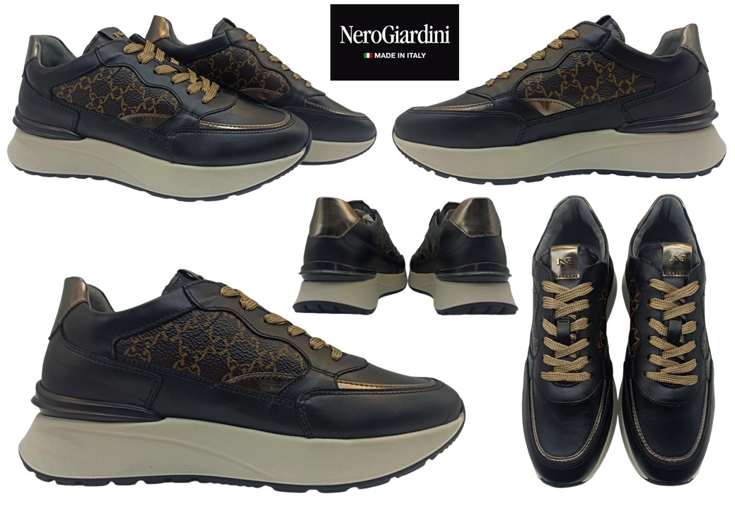 Scarpe da donna Nero Giardini I411545D 100 Colore Nero. NeroGiardini, sinonimo di qualità artigianale Made in Italy, presenta queste sneakers platform basse dal design contemporaneo e glamour. Realizzate in vera pelle e tessuto tecnico, uniscono resistenza e leggerezza, ideali per la stagione autunno/inverno.Dotate di zeppa integrata che dona slancio alla silhouette, offrono il massimo comfort grazie al plantare interno estraibile e alla chiusura con lacci regolabili. La calzata è comoda e pratica, perfetta per l’uso quotidiano.Versatili e di tendenza, si abbinano facilmente a look casual, sportivi o urban chic, rendendole le compagne ideali per il tempo libero, le passeggiate e la vita in città. Un modello che coniuga moda, comfort e stile italiano, pensato per la donna dinamica e femminile che non vuole rinunciare all’eleganza.