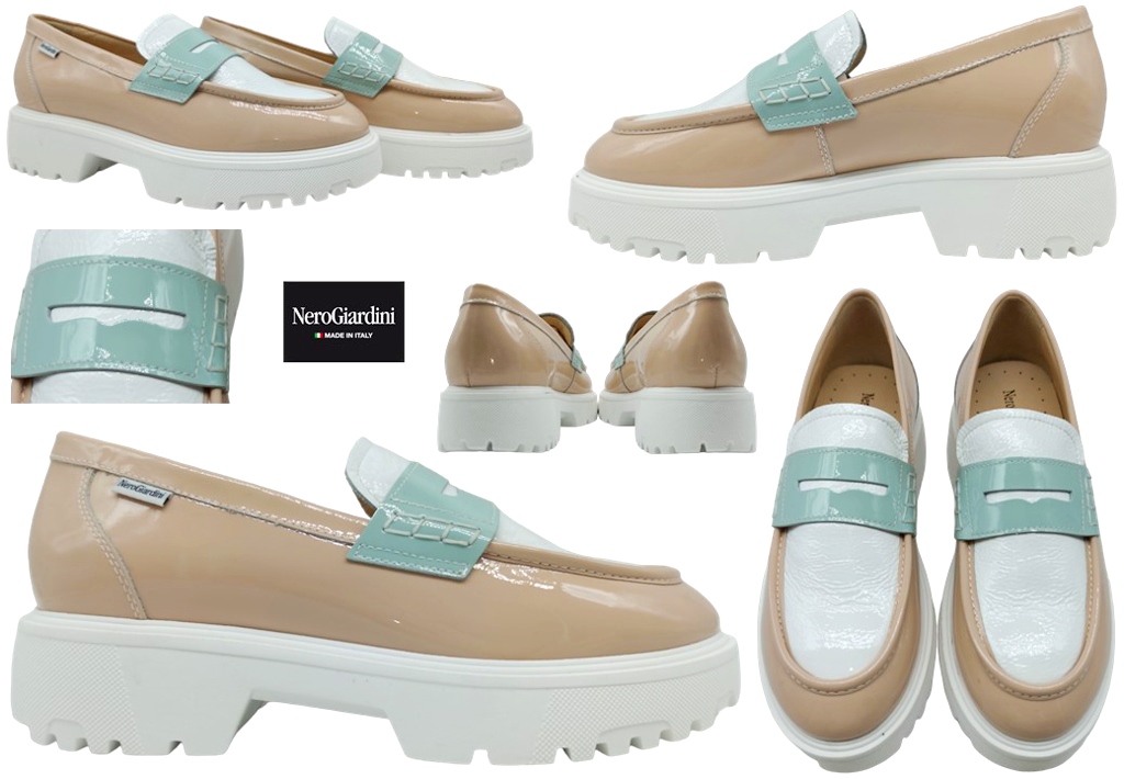 Scarpe da Donna Mocassini Nero Giardini E409692D 720 Colore Nude-Bianco con fibbia centra verde acqua. Mocassini Nero Giardini dal gusto contemporaneo, realizzati in vera pelle effetto vernice e impreziositi da una fibbia verde acqua che aggiunge un tocco originale. Il modello slip-on si indossa facilmente, mentre il tacco basso da 4 cm con plateau da 2,8 cm offre stabilità e comfort per tutto il giorno. Si abbinano con naturalezza a jeans, pantaloni, gonne e abiti leggeri, dal casual al più elegante.