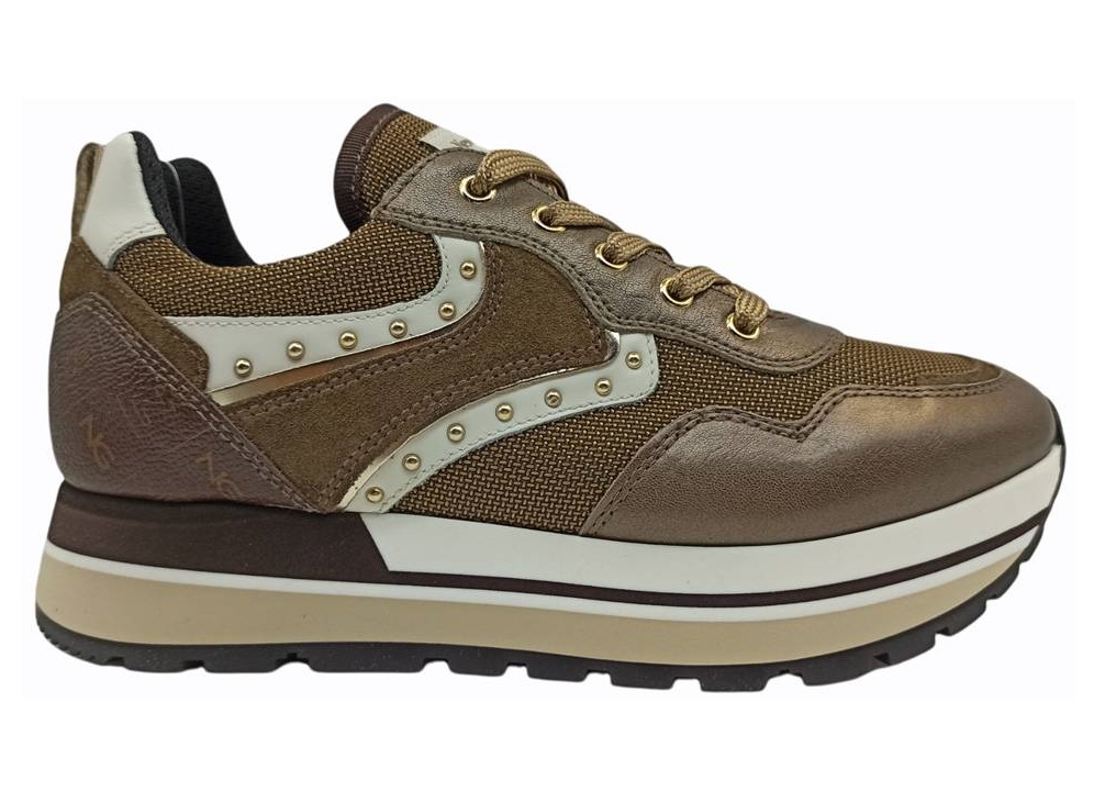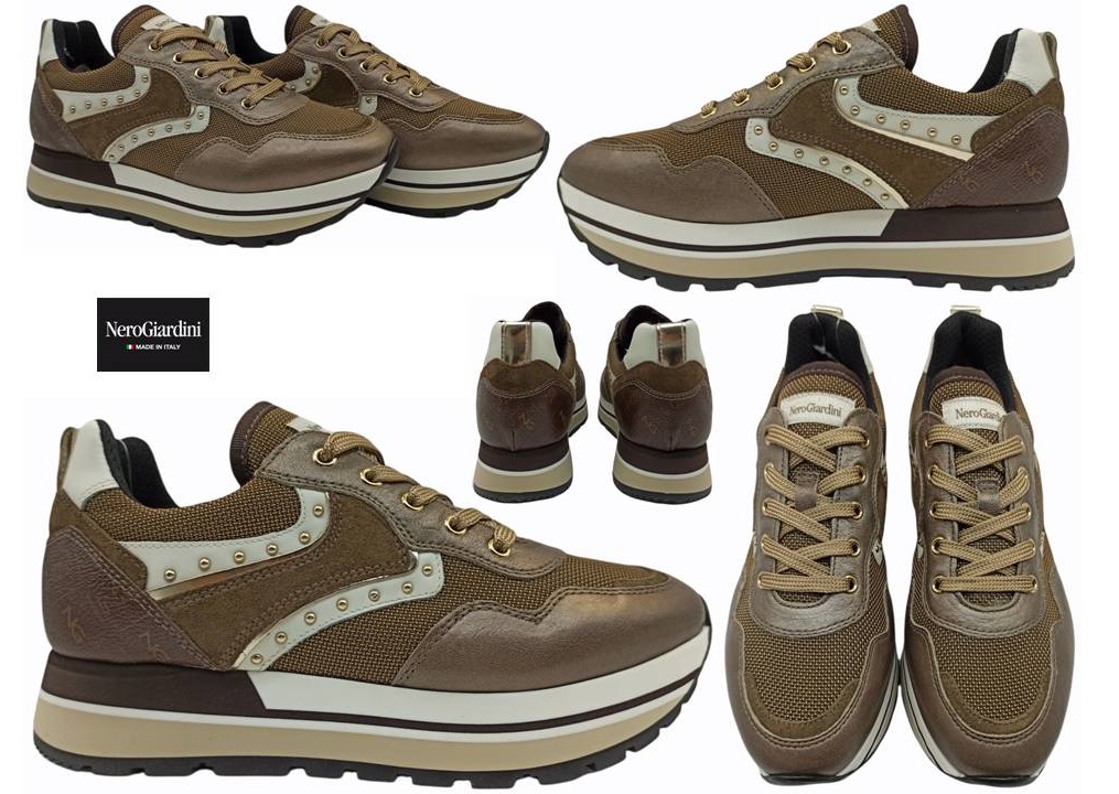 Scarpe da donna Nero Giardini I116941D 322 Colore Verdegris con profili bianchi e oro impreziosite con borchiette Sneakers Platform Basse Casual Sportive Comode alla Moda Glamour da Passeggio di Tendenza con Zeppa Tomaia in Vera Pelle Tessile Plantare Interno Estraibile Chiusura con Lacci Stringhe Made in Italy Autunno Inverno
