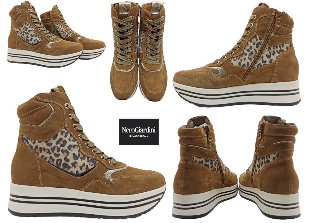 Scarpe da donna Nero Giardini I205282D 339 Colore Malto-Miele. Sneakers platform alte Nero Giardini dal look grintoso e contemporaneo. Realizzate in vera pelle scamosciata con dettagli in camoscio e stampa pitone animalier. La zeppa integrata slancia la silhouette restando comoda, mentre il plantare estraibile aggiunge praticità e igiene. Lacci + zip laterale per una calzata regolabile e veloce. Perfette per autunno/inverno, ideali per outfit casual urbani con un tocco glamour.