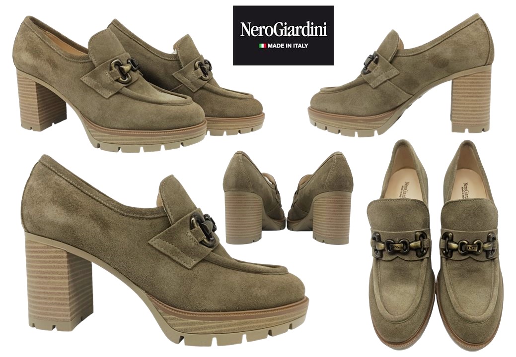 Scarpe da Donna Mocassini Nero Giardini I411434D 501 Colore Beige. Eleganti scarpe in vera pelle scamosciata color beige, con tacco medio da 8 cm e plateau da 2,3 cm per un comfort ottimale. Impreziositi da una catena centrale che dona un tocco glamour, questi mocassini sono perfetti per look casual e alla moda. Modello a infilare, ideale per le stagioni autunno e inverno