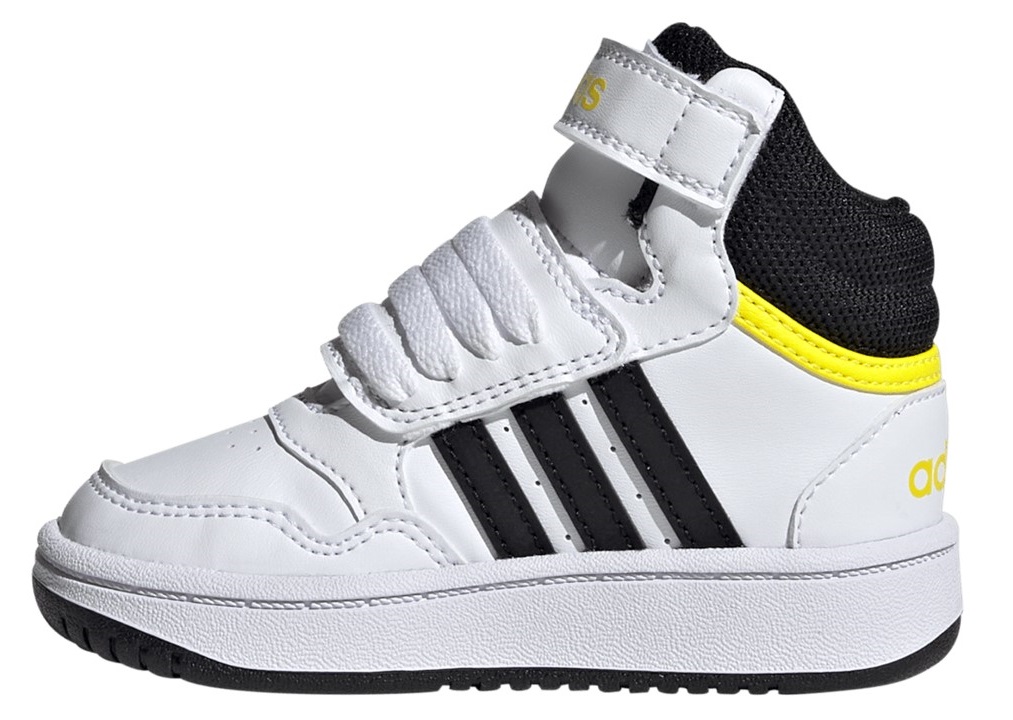 Scarpe da Tennis Infant Bambino Bimbo Bambini Adidas HOOPS MID 3.0 AC I GZ1933 Bianco con baffatura nera e profili gialli. Sneakers alte dallo stile sportivo/casual, adatte a scuola, tempo libero e passeggiate. Comode anche per attività come ginnastica, palestra/allenamento, basket, skate. Chiusura pratica a strappo, ideale per i più piccoli. Tomaia in similpelle facile da pulire e plantare estraibile per maggiore igiene e praticità. Consigliate per la stagione autunno/inverno.