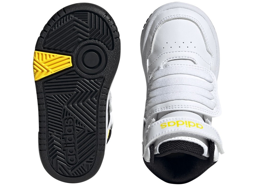 Scarpe da Tennis Infant Bambino Bimbo Bambini Adidas HOOPS MID 3.0 AC I GZ1933 Bianco con baffatura nera e profili gialli. Sneakers alte dallo stile sportivo/casual, adatte a scuola, tempo libero e passeggiate. Comode anche per attività come ginnastica, palestra/allenamento, basket, skate. Chiusura pratica a strappo, ideale per i più piccoli. Tomaia in similpelle facile da pulire e plantare estraibile per maggiore igiene e praticità. Consigliate per la stagione autunno/inverno.