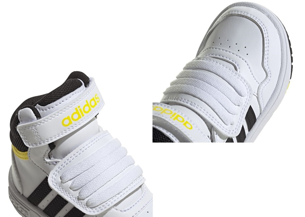 Scarpe da Tennis Infant Bambino Bimbo Bambini Adidas HOOPS MID 3.0 AC I GZ1933 Bianco con baffatura nera e profili gialli. Sneakers alte dallo stile sportivo/casual, adatte a scuola, tempo libero e passeggiate. Comode anche per attività come ginnastica, palestra/allenamento, basket, skate. Chiusura pratica a strappo, ideale per i più piccoli. Tomaia in similpelle facile da pulire e plantare estraibile per maggiore igiene e praticità. Consigliate per la stagione autunno/inverno.