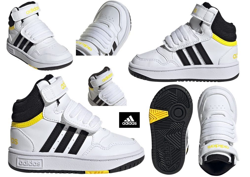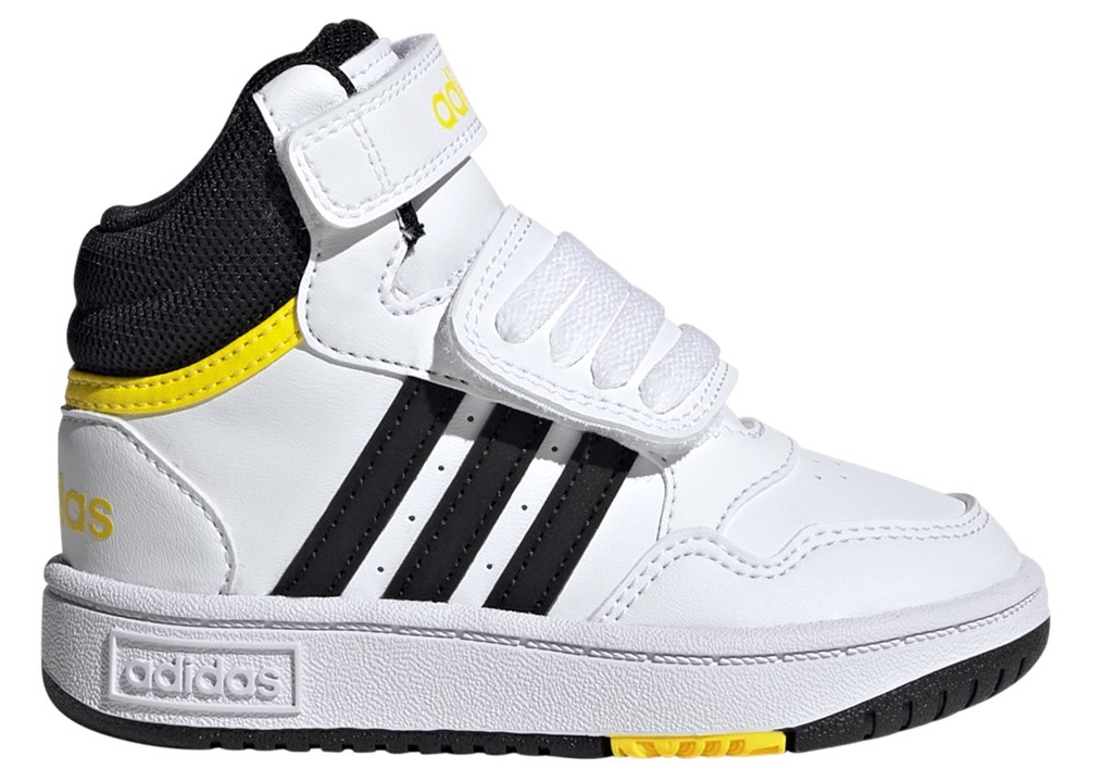 Scarpe da Tennis Infant Bambino Bimbo Bambini Adidas HOOPS MID 3.0 AC I GZ1933 Bianco con baffatura nera e profili gialli. Sneakers alte dallo stile sportivo/casual, adatte a scuola, tempo libero e passeggiate. Comode anche per attività come ginnastica, palestra/allenamento, basket, skate. Chiusura pratica a strappo, ideale per i più piccoli. Tomaia in similpelle facile da pulire e plantare estraibile per maggiore igiene e praticità. Consigliate per la stagione autunno/inverno.