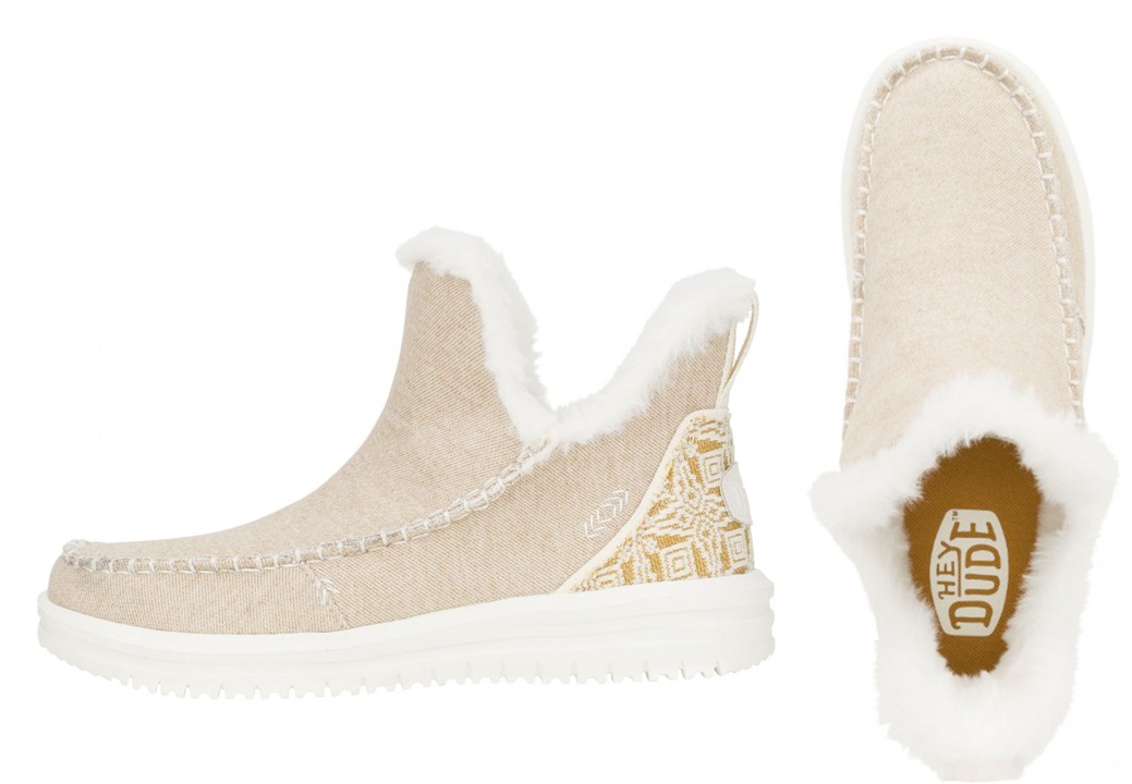Tronchetti sneakers da donna Hey Dude 42030 202 Camden Brushed Cozy con zeppa platform bassa, ideali per un outfit casual e contemporaneo. La tomaia in tessuto beige è abbinata a collo e interno imbottiti in finto shearling, per offrire calore e una sensazione morbida durante l’autunno/inverno. La calzata slip-on senza lacci permette di indossarli in pochi secondi, in modo pratico e comodo. L’intersuola DUDESOLE con inserto ammortizzato e la soletta DUDEFLOAT in schiuma EVA assicurano leggerezza, supporto e comfort a lungo. Perfetti per passeggiate, tempo libero e utilizzo quotidiano.